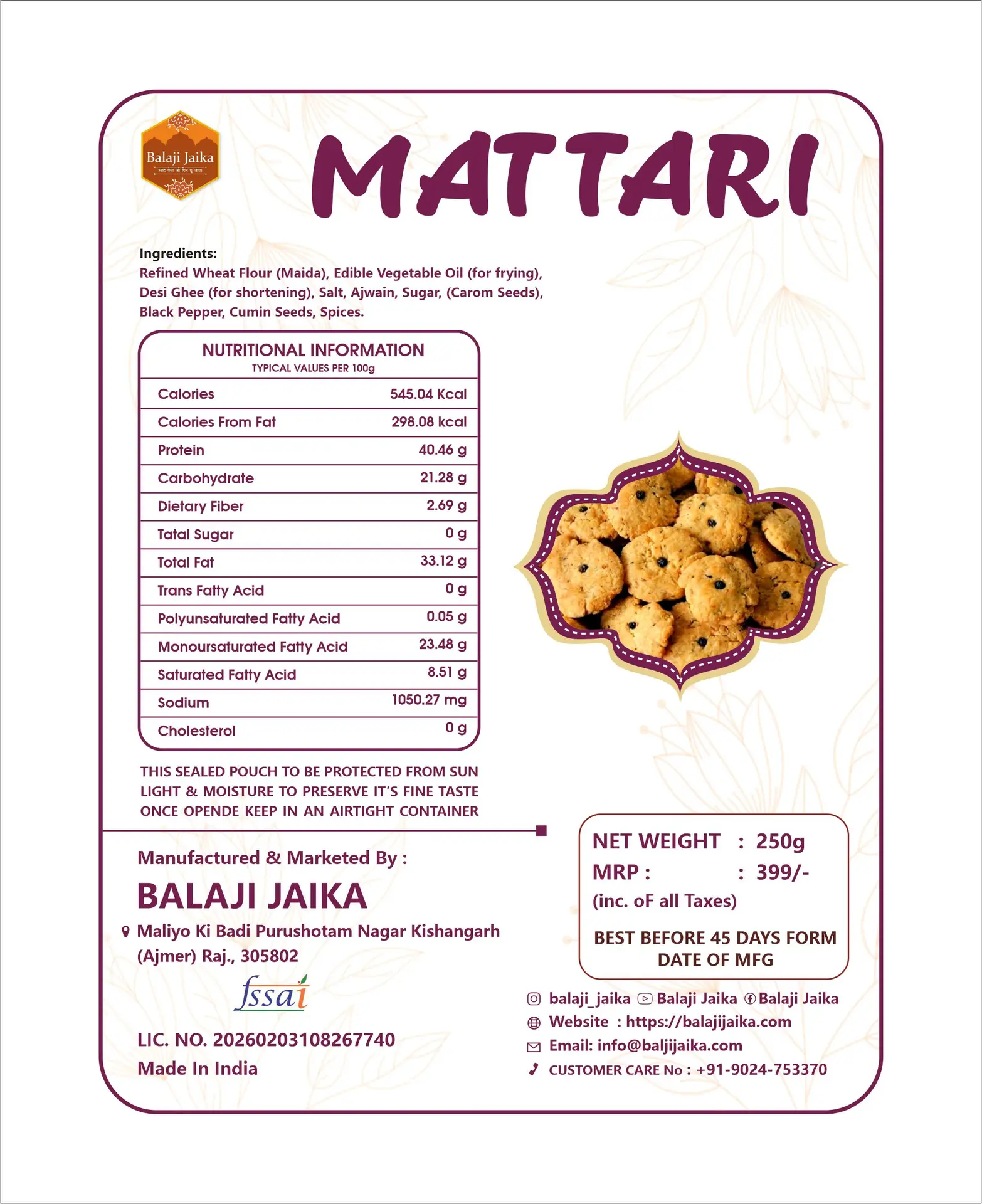 Balaji Jaika Mattari is a traditional Indian snack, made to deliver the authentic taste of home in every bite. Prepared using carefully selected ingredients and time-honoured recipes, these mattaris are crispy, flavourful, and perfectly balanced.